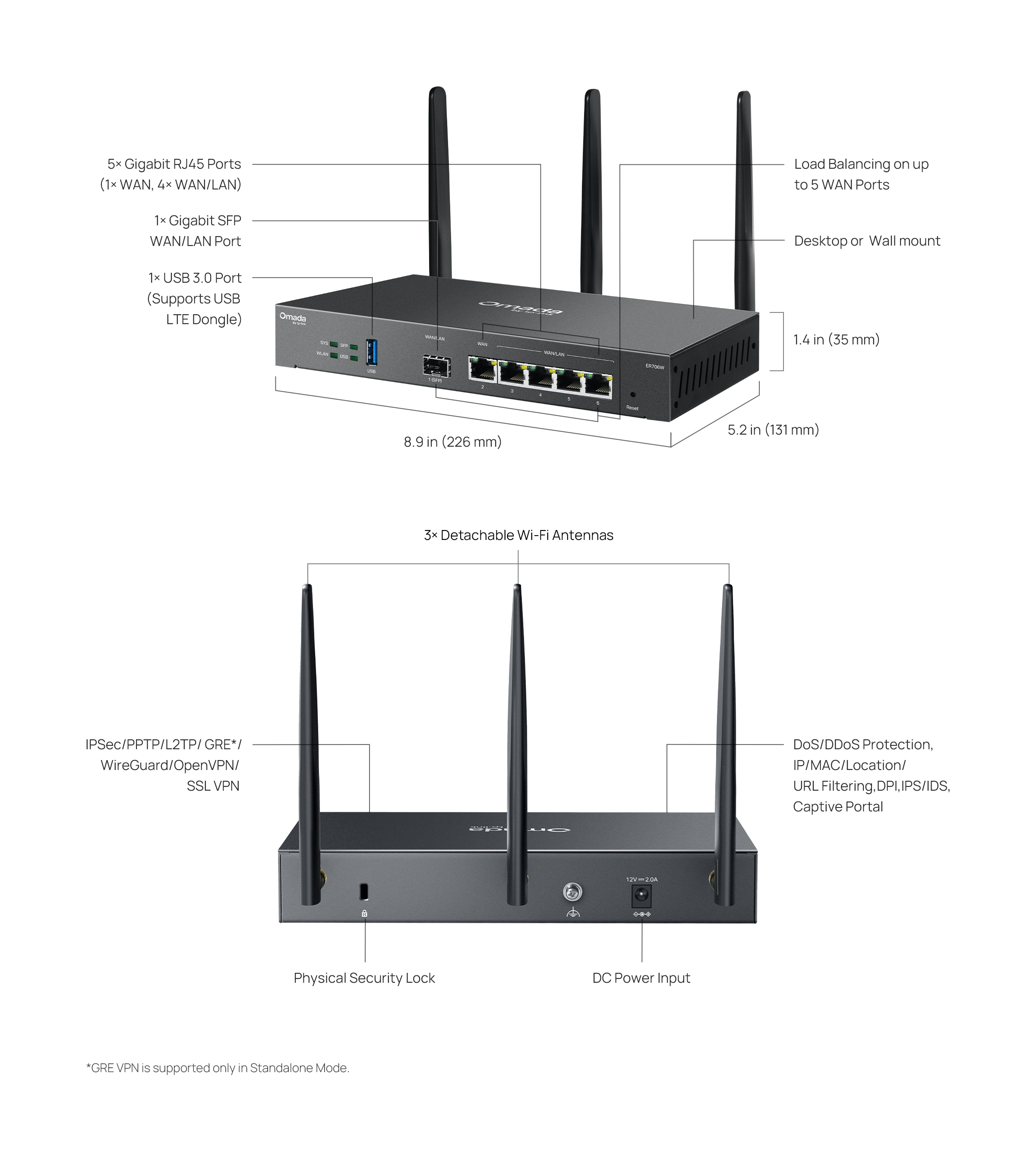 | Interface | • 1 Gigabit SFP WAN/LAN Port• 1 Gigabit WAN Port• 4 Gigabit LAN/WAN Ports• 1 USB3.0 (supports USB LTE dongle and USB Storage) |