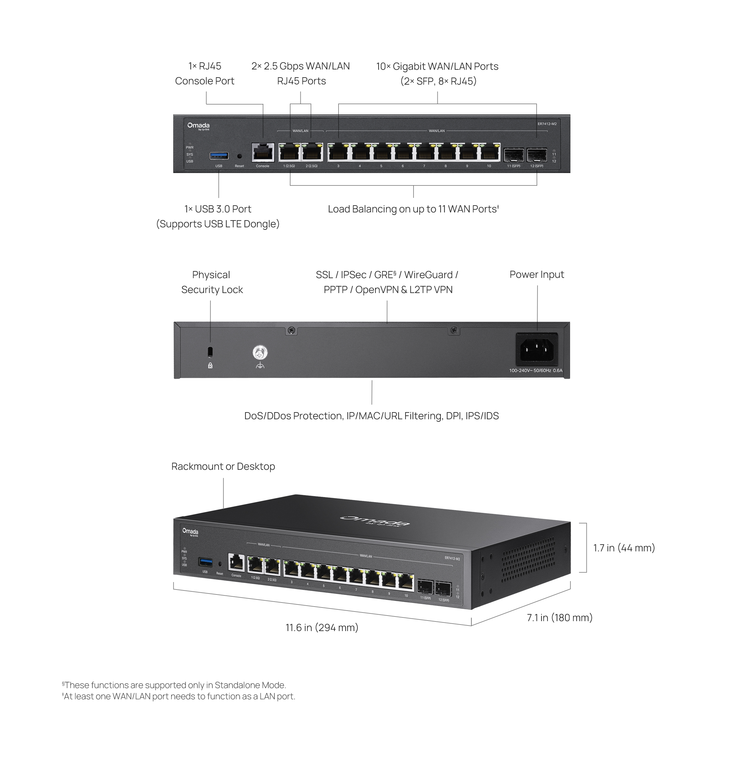 | Interface | • 2× 2.5G RJ45 WAN/LAN Port• 2× Gigabit SFP WAN/LAN Ports• 8× Gigabit RJ45 WAN/LAN Ports• 1× RJ45 Console Port• 1× USB 3.0 Port (USB LTE dongle and USB Storage)# |