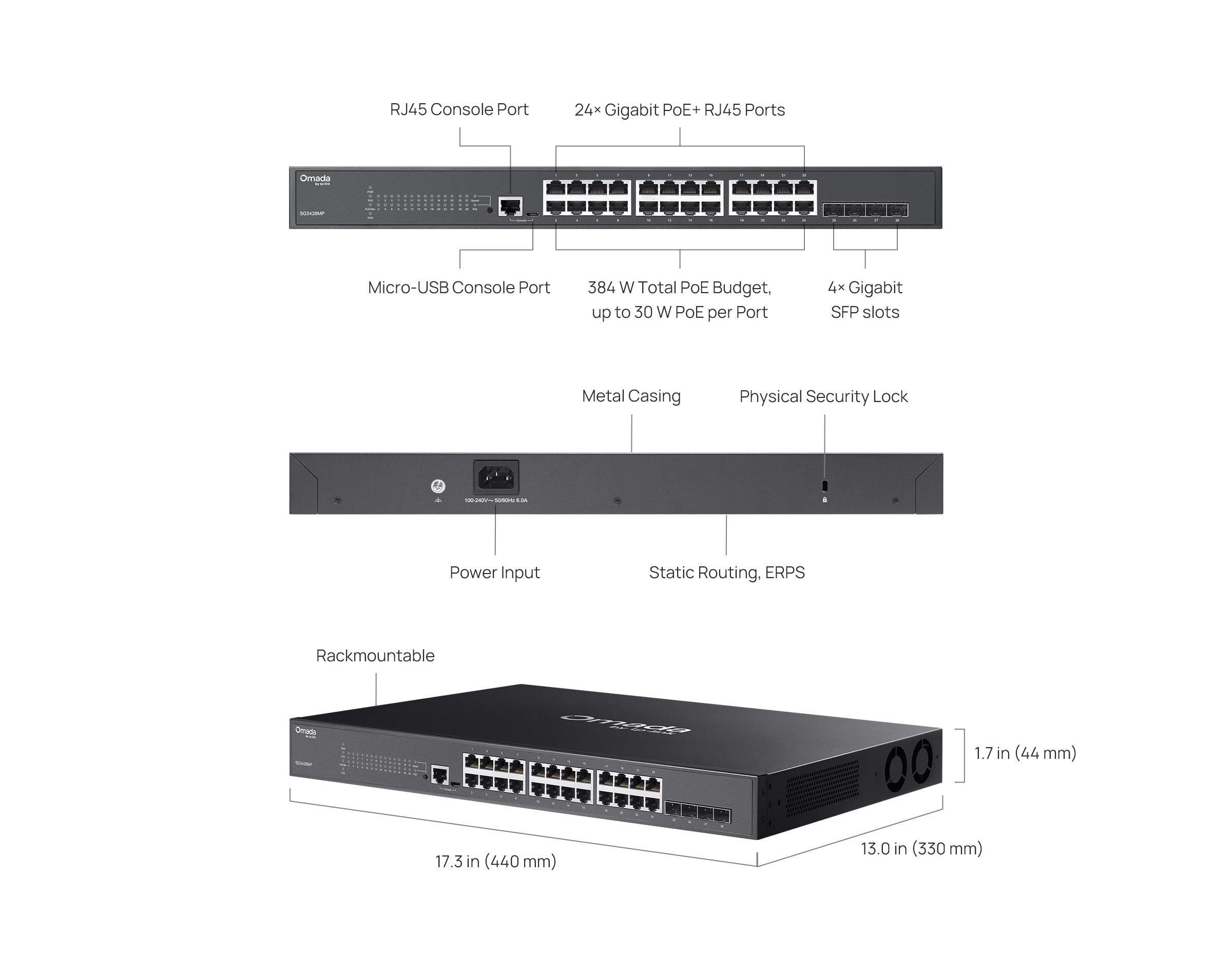 | Package Content | • SG3428MP Switch• Power Cord• Console Cable• Mounting Brackets• Rubber Feet• Screws• Installation Guide |