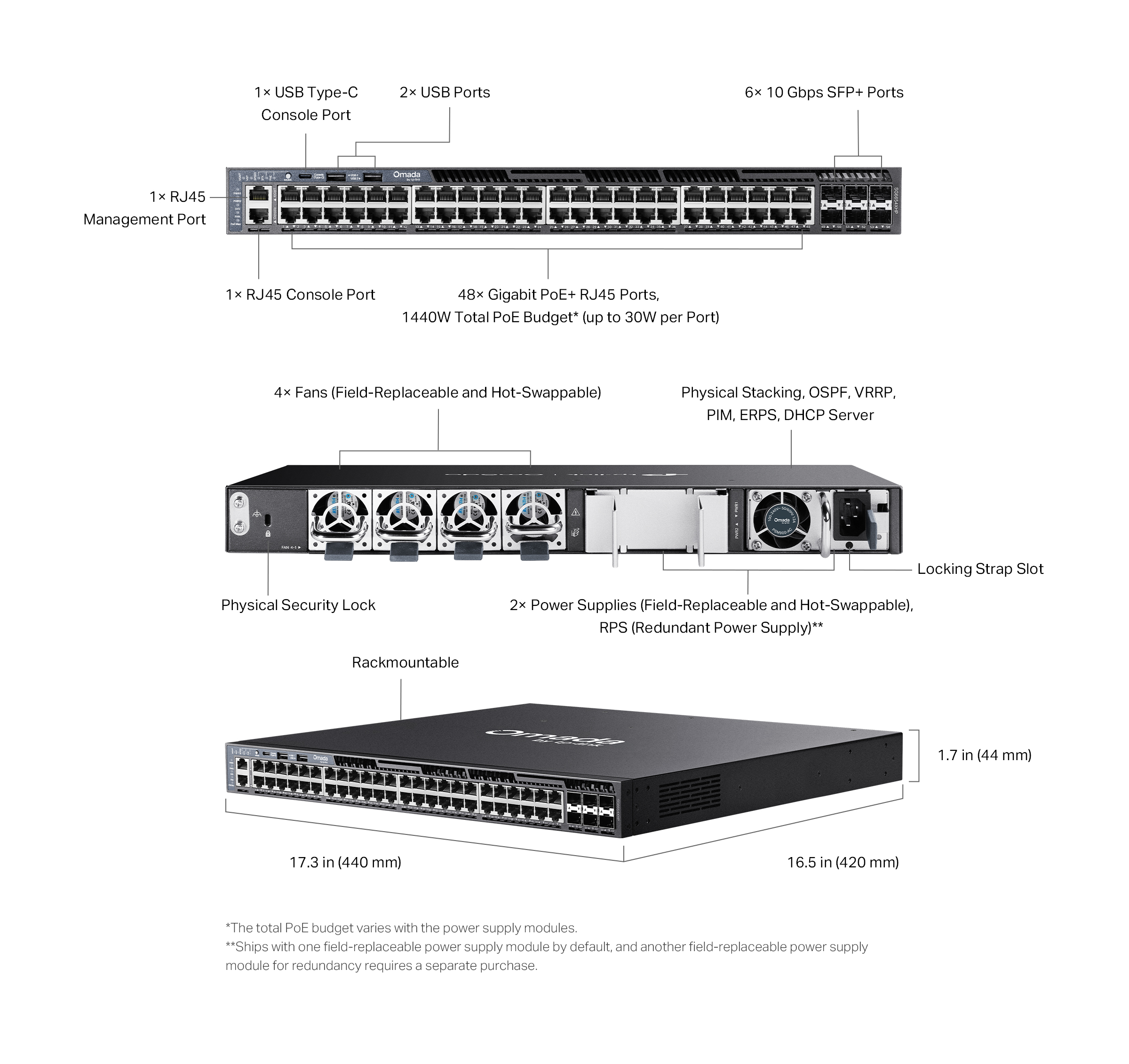 PoE Ports (RJ45) | • Standard: 802.3at/af compliant• PoE+ Ports: 48 Ports, up to 30 W per port• PoE Power Budget: up to 1440 W**The total PoE budget varies with the power supply modules. |