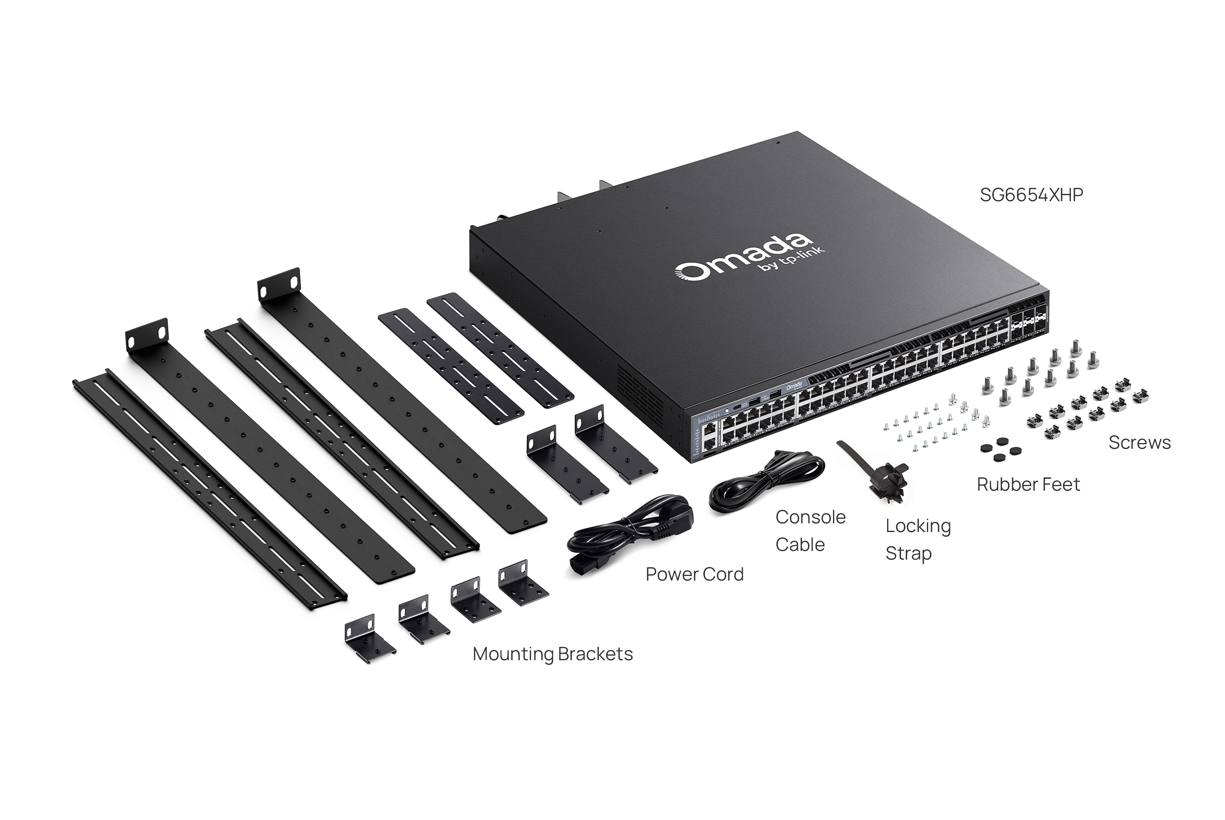 Package Content | • SG6654XHP Switch• Power Cord• RJ45 Console Cable• Locking Strap• Rackmount Kit• Rubber Feet• Quick Installation Guide |