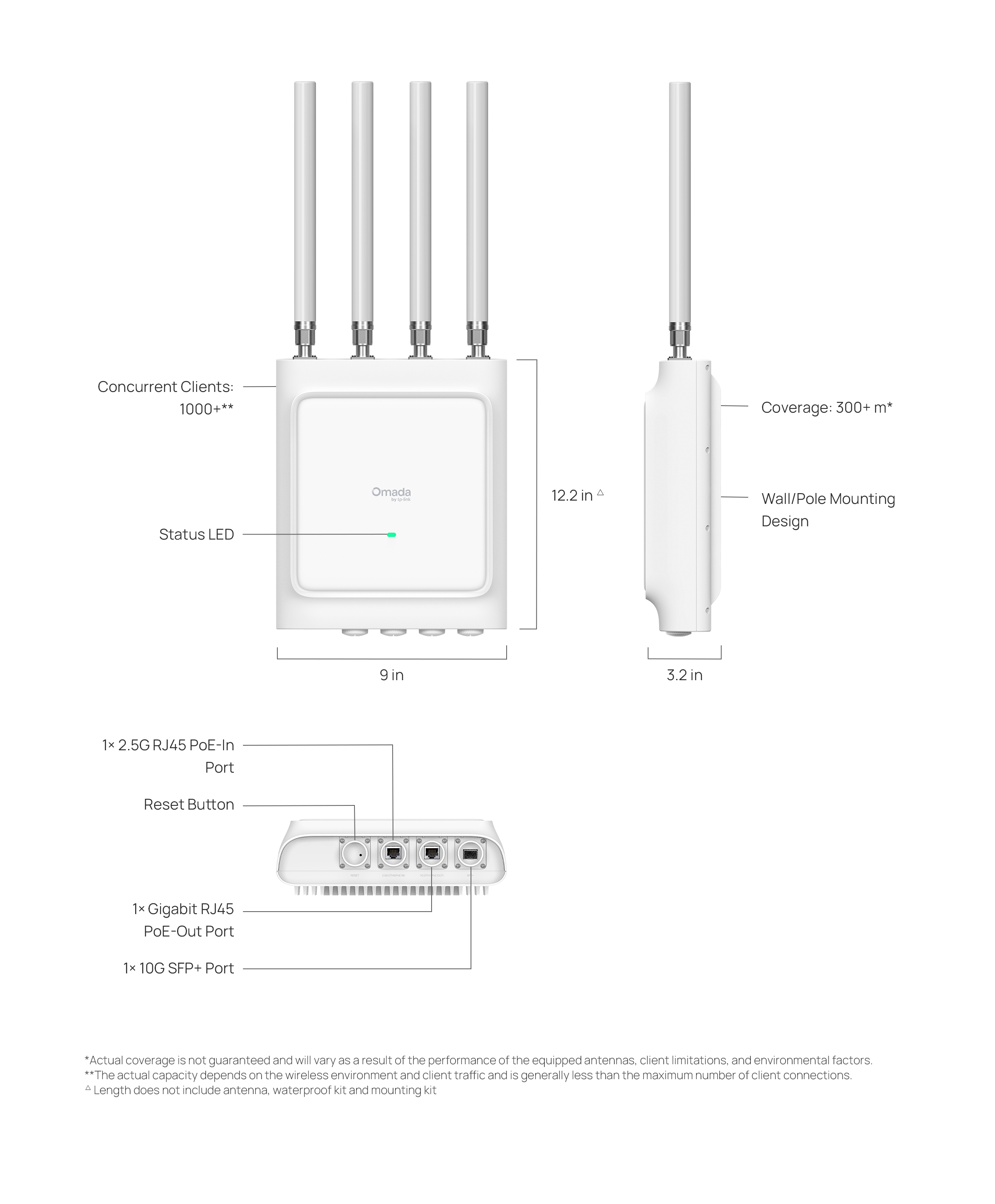 | Dimensions ( W x D x H ) | 9.5 × 3.2 × 12.3 in (240 × 80 × 312 mm) (excluding antennas, waterproofing kit, and mounting kit) |