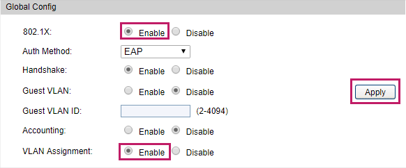 4)Choose the menu Network Security > 802.1X > Global Config to load the following page. In the Global Config section, enable 802.1X and VLAN Assignment globally and click Apply.