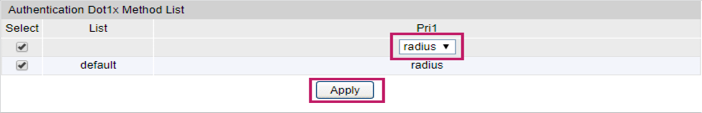 2)Choose the menu Network Security > AAA > Dot1x List, select an existing RADIUS server group for authentication from the Pri1 drop-down list and click Apply.