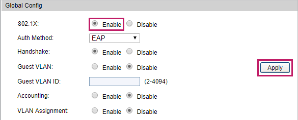 4)Choose the menu Network Security > 802.1X > Global Config, enable 802.1X globally and click Apply.