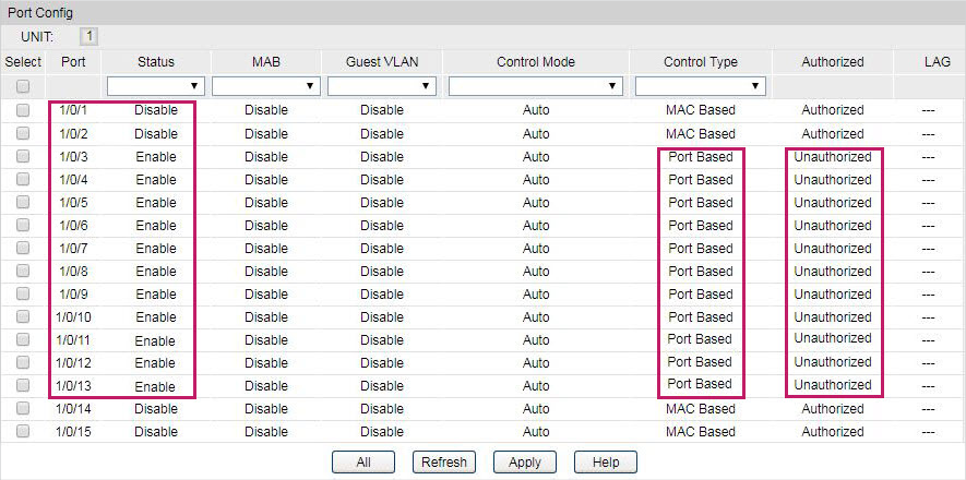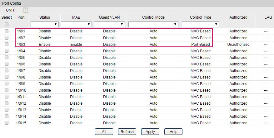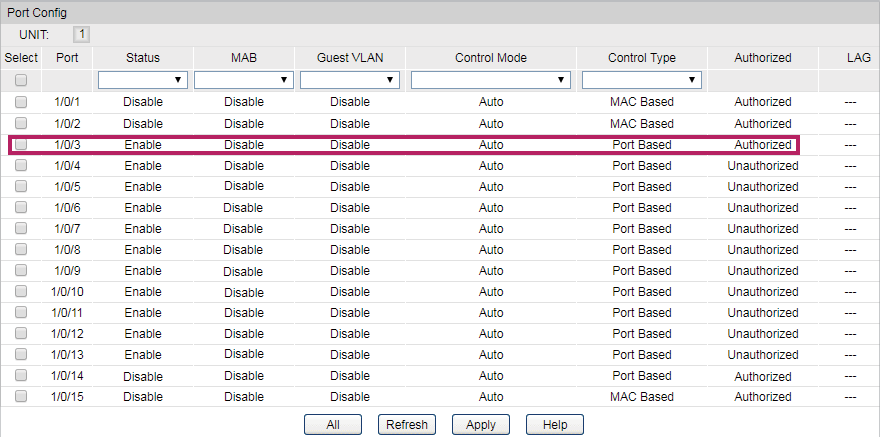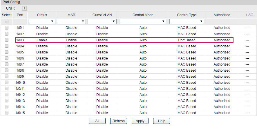 Port State MAB State GuestVLAN PortControl PortMethod Authorized LAG