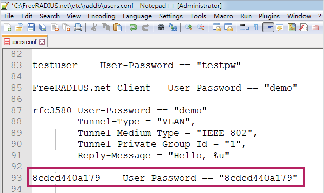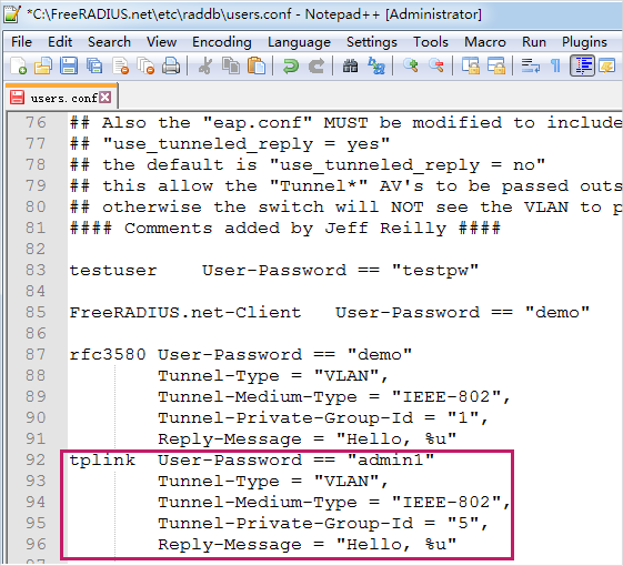 User-name and User-Password, which is the authentication information of the clients. You can replace rfc3580 with the username which you want and replace demo with the new password. Or you can ignore the default user information and add new user information which has identical format in the next line.