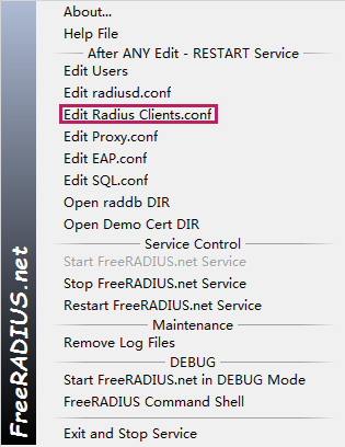 2)Right click the icon and choose Edit Radius Clients.conf to add an entry for the RADIUS client (T2600G-28TS).