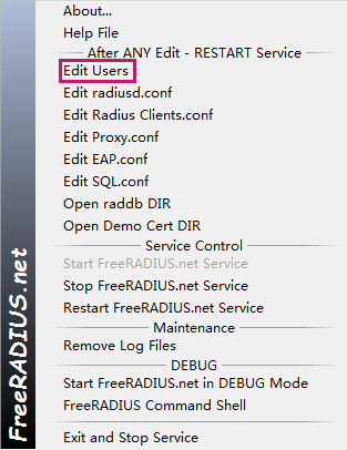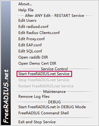 1)Right click the icon to load the following window. Choose Start FreeRADIUS.net Service to start the RADIUS server.