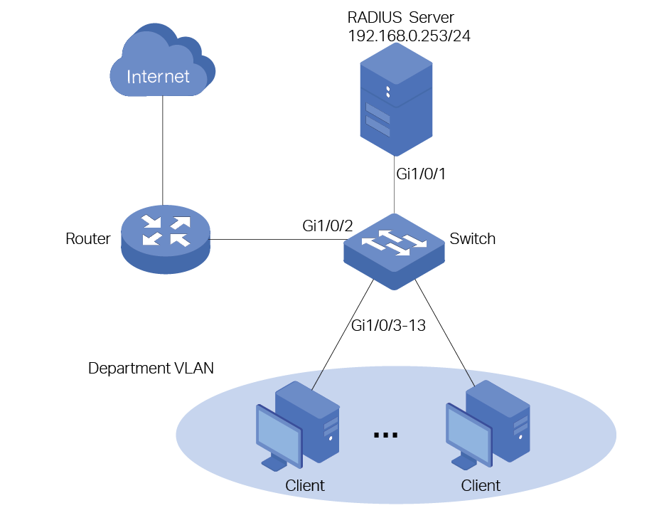 To enhance network security, a company requires that the employees can access the network normally only when their computers pass the authentication successfully. At the same time, to reduce the workload of the configuration, it is required that the ten authenticated computers can be automatically assigned to the VLANs of their departments. The network topology is shown as below.