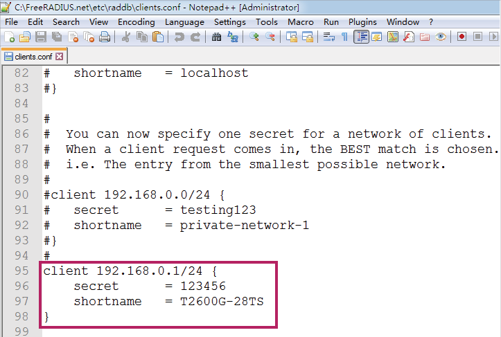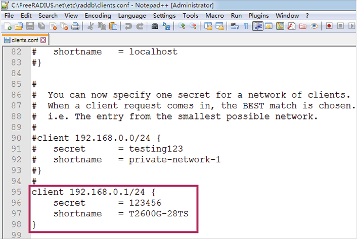 One client section means a RADIUS client. You can choose one of the section clients and edit the following attributes. Or you can add a new client section to meet your requirements. The Clients.conf should be modified in three aspects: