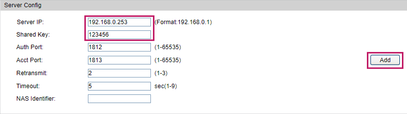 3)Choose the menu Network Security > AAA > RADIUS Config, and enter 192.168.0.253 which is the IP address of the RADIUS server. Enter the shared key between the RADIUS server and the switch. The RADIUS server and the switch use the key string to encrypt passwords and exchange responses.