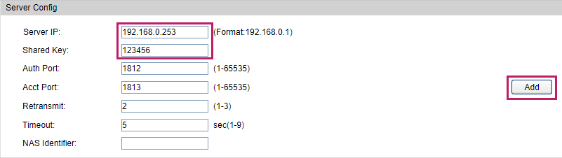 3)Choose the menu Network Security > AAA > RADIUS Config to load the following page. Enter the IP address of the RADIUS server and the shared key which is pre-defined in the Radius Clients.conf.