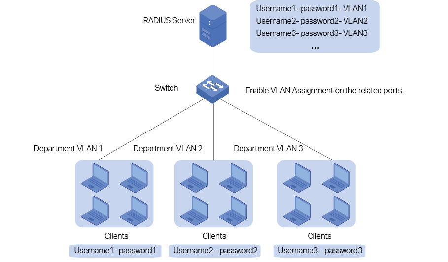 The figure below shows the typical topology of VLAN Assignment. VLAN Assignment is port-based. With VLAN Assignment enabled, the RADIUS server will send the VLAN configuration when the port is authenticated. VLAN IDs are assigned based on switch ports.