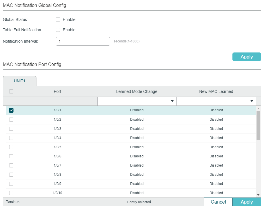 The following example shows how to enable new-MAC-learned trap on port 1, and set the interval time as 10 seconds. After you have further configured SNMP, the switch will bundle notifications of new addresses in every 10 seconds and send to the management host.