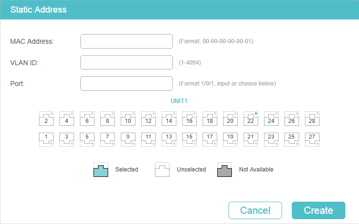 You can add static MAC address entries by manually specifying the desired MAC address or binding dynamic MAC address entries.