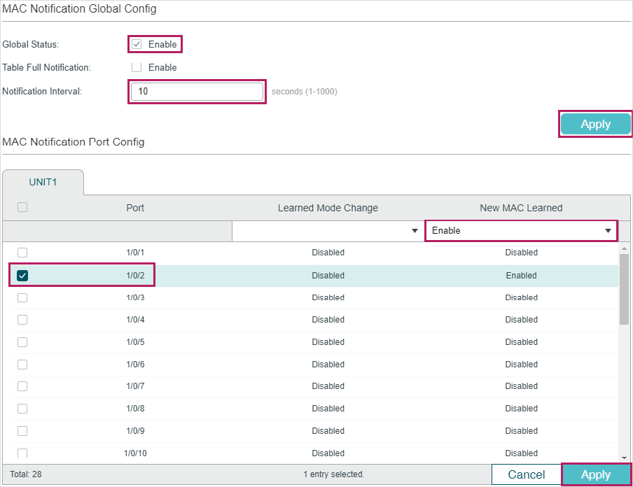 new-mac-learned: With new-mac-learned enabled, when the specified port learns a new MAC address, a notification will be generated and sent to the management host.