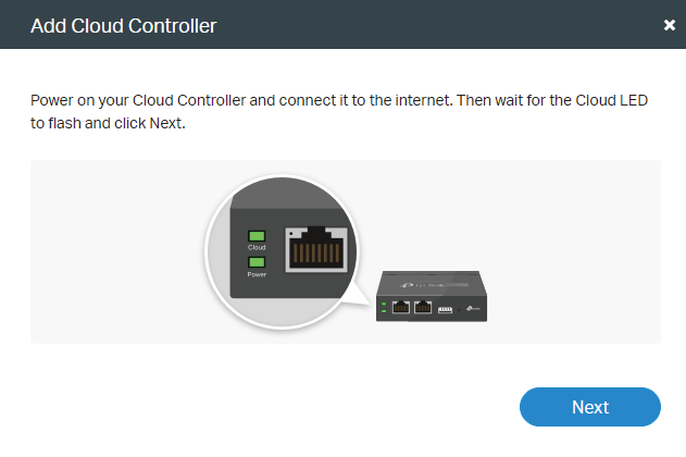 • The Omada Cloud Controller is powered on and its Cloud LED is flashing, which indicates that it has access to the internet.