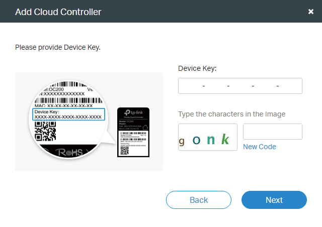 4 ) Click Next to load the following page. Enter the device key, which is displayed on the back of the Omada Cloud Controller. Type the characters in the Image.