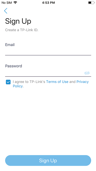 2 ) Click Sign Up to load the following page. Enter your email address and a password, and confirm your password. This email address will be your TP-Link ID. Check the box next to I agree to TP-Link's Term of Use and Privacy Policy, if you agree to them. Click Sign Up. An activation email will be sent to your email address.