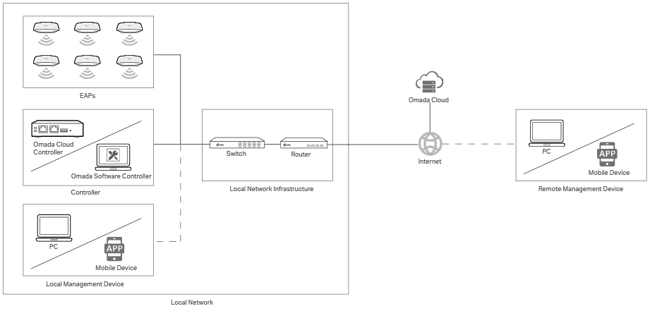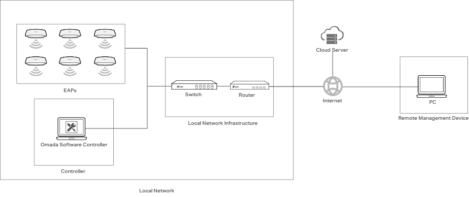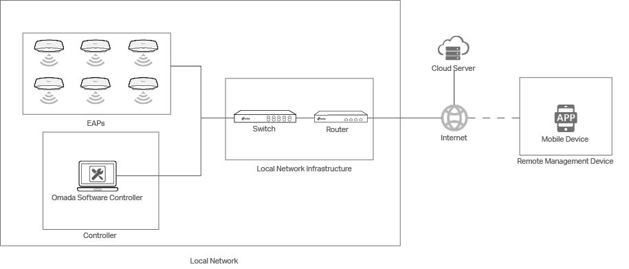 • A controller can manage mass EAPs centrally in the local network. • You can access the controller via a local management device. • You can also access the controller remotely via Omada Cloud. |