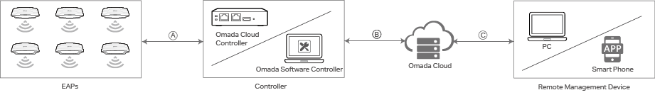• Omada Cloud helps transmit data between the controller and remote management devices. |
