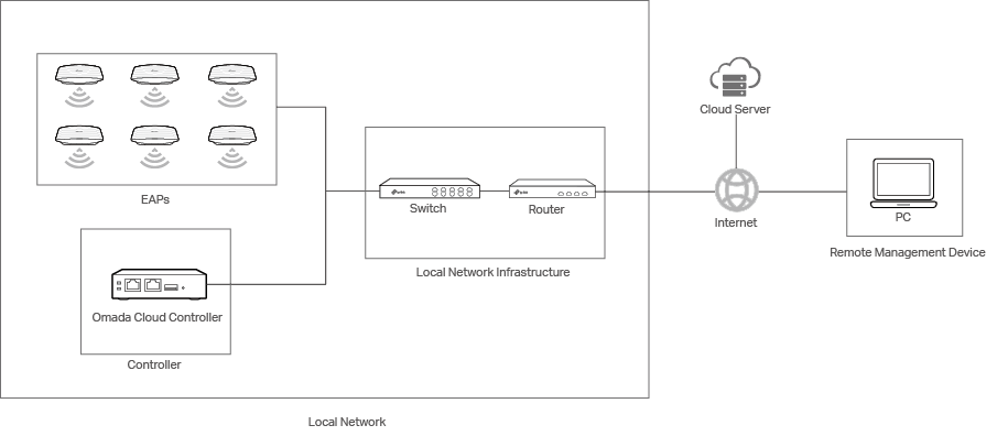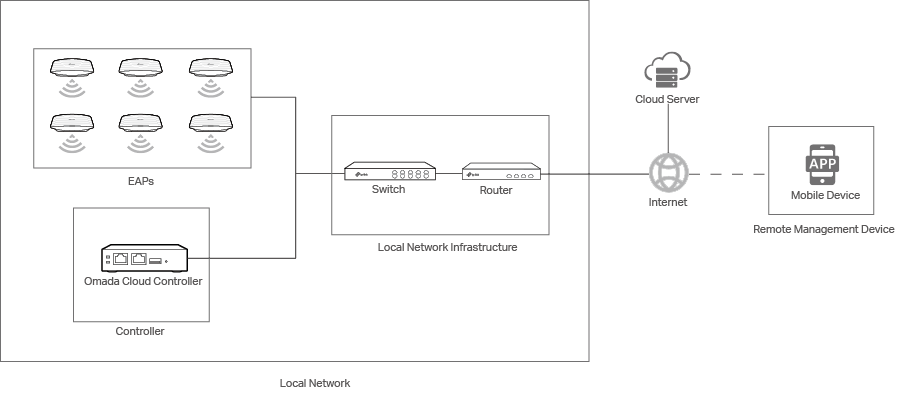 Set up your network according to the following figure. EAPs and the controller are connected to the local network. Devices in the local network can obtain their IP addresses from the router and access the internet via the router. Make sure that both the remote management device and the controller have access to the internet.