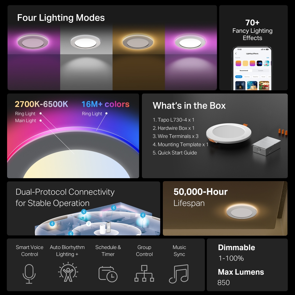 - 4 Lighting Modes - Tapo Smart Recessed Downlight KIT features 4 lighting modes that meet different life scenes and needs.
