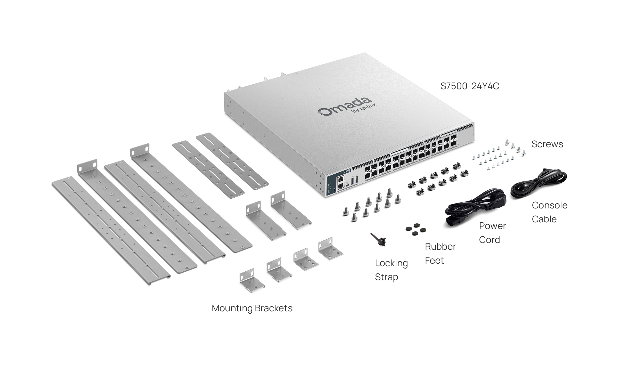 | パッケージ内容 | • S7500-24Y4C本体 • 電源ケーブル • RJ45コンソールケーブル • 取り付けバンド • ラックマウントキット • ゴム足 • Installation Guide(設置/設定ガイド) |