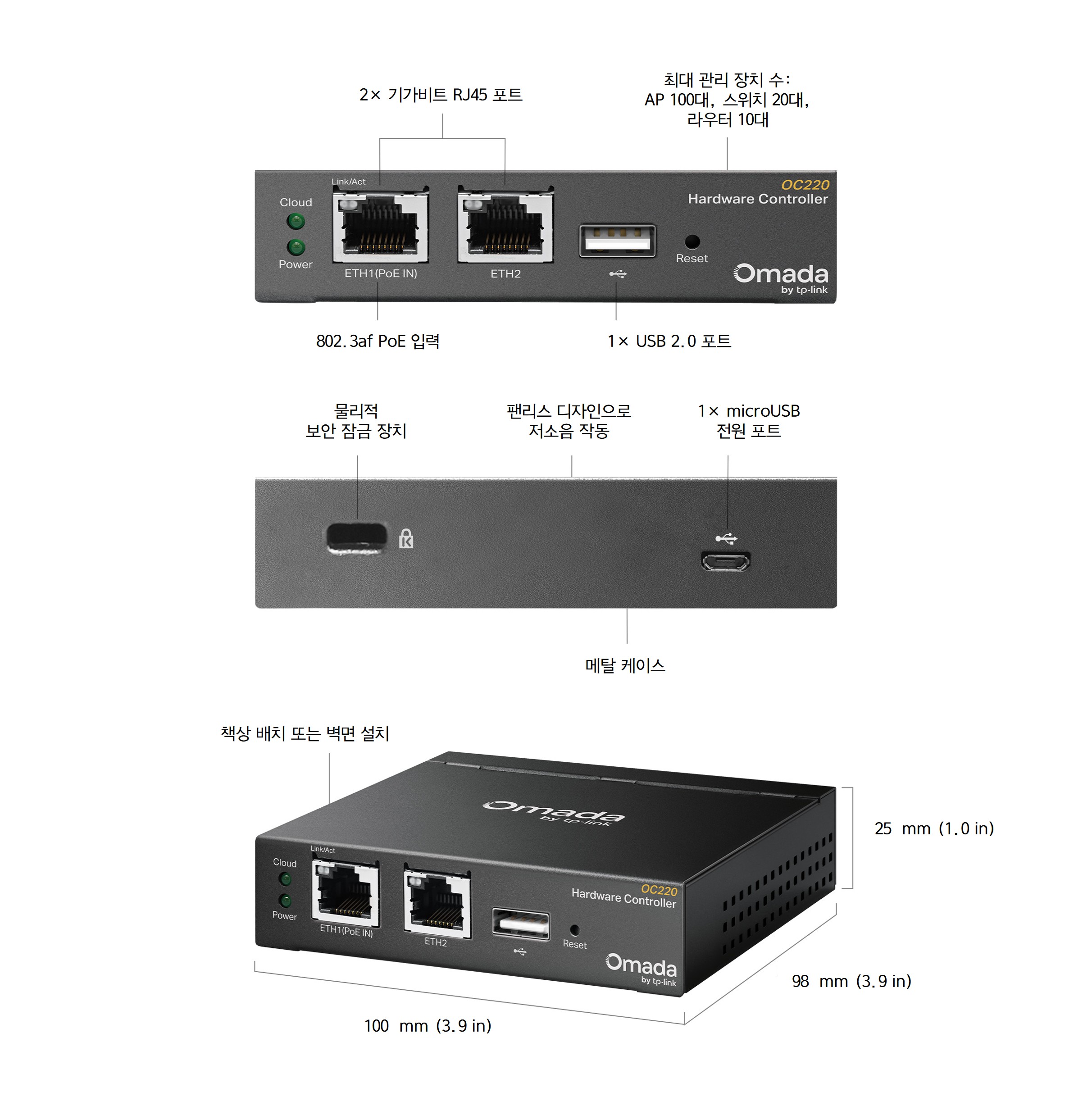 | 구성품 | • Omada 하드웨어 컨트롤러 OC220 • 빠른 설치 가이드 • RJ45 이더넷 케이블 |
