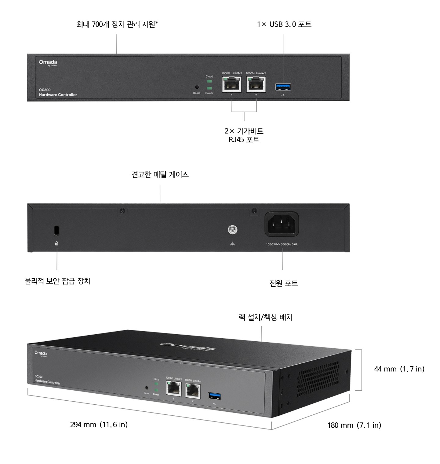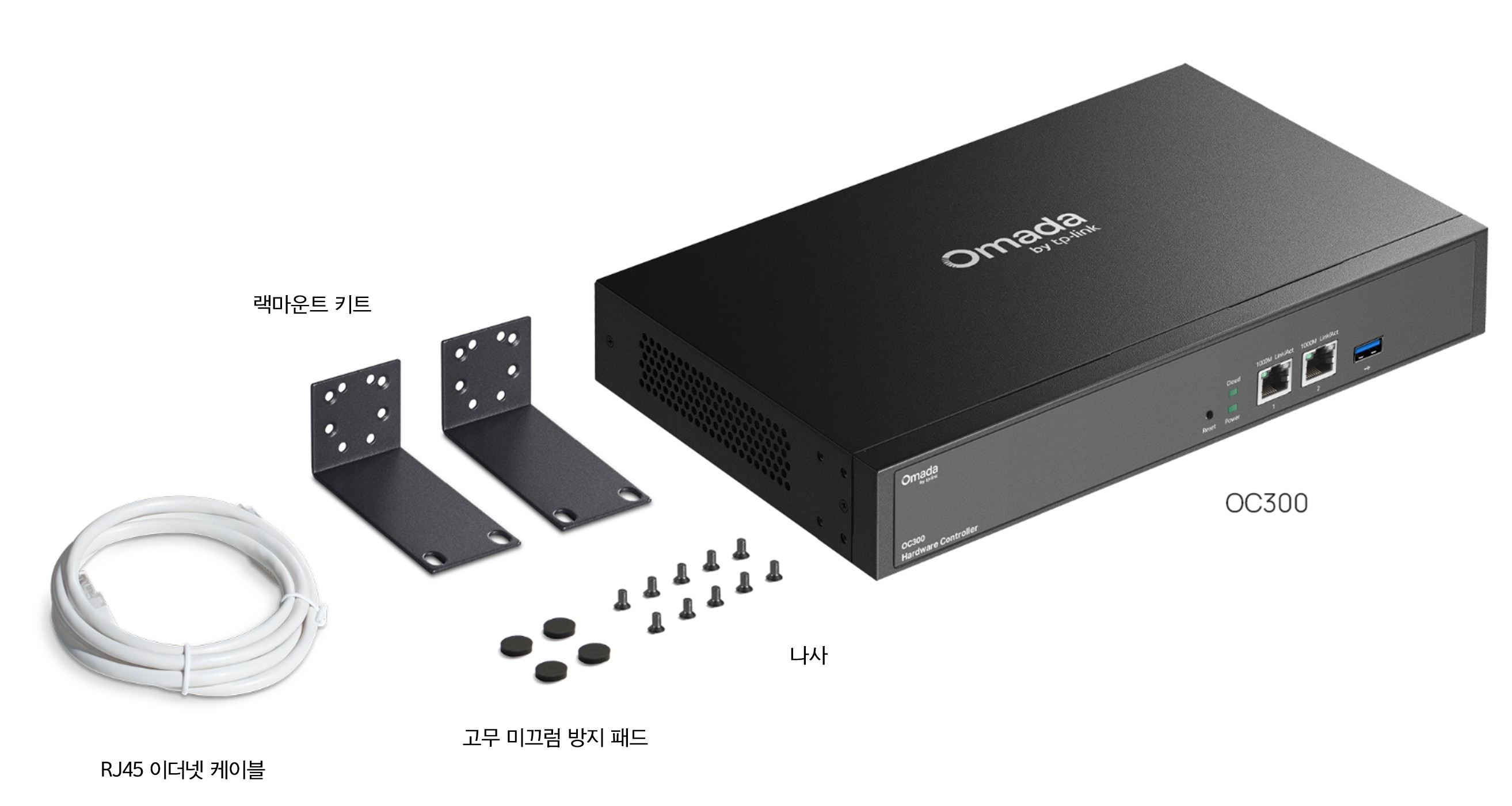 | 구성품 | • Omada 하드웨어 컨트롤러 OC300 • 빠른 설치 가이드 • 이더넷 케이블 • 전원 코드 • 랙마운트 키트 |