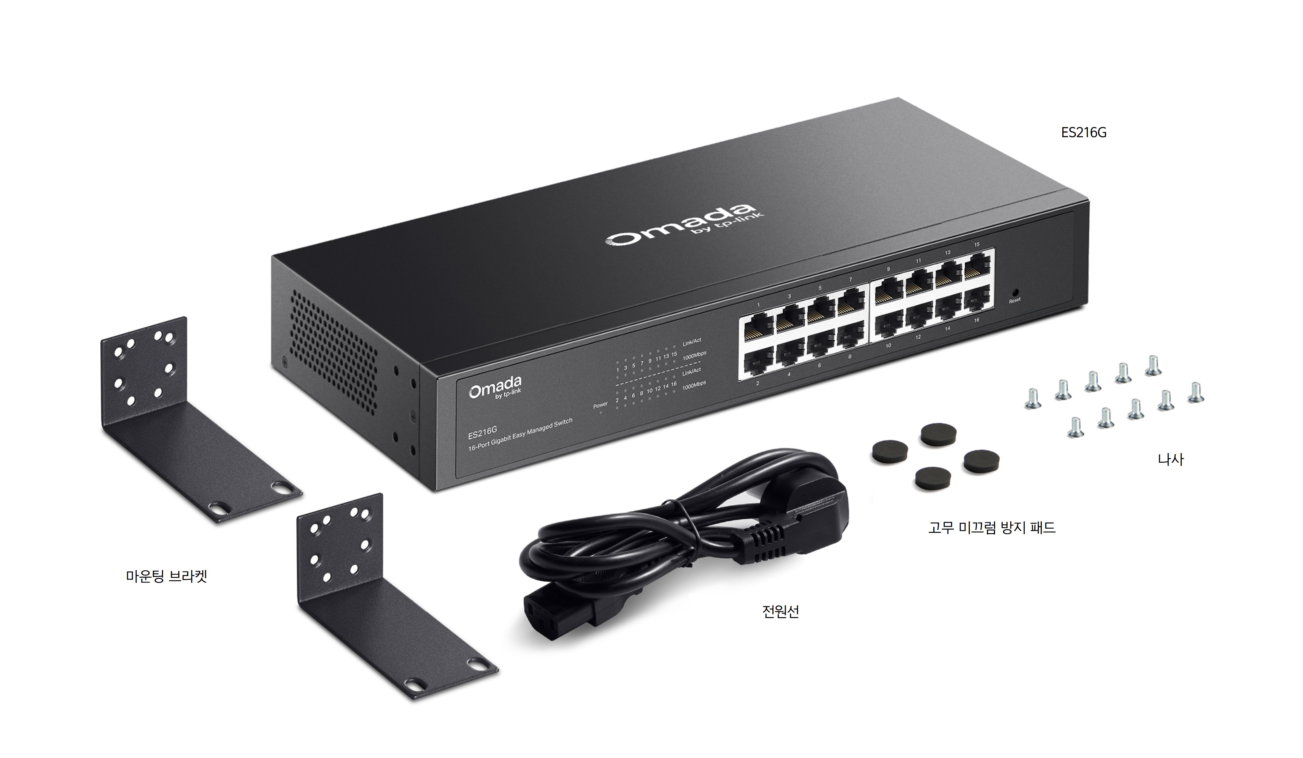 | 구성품 | • ES216G • 전원 코드 • 고무 미끄럼 방지 패드 • 마운팅 브라켓 • 나사 • 설치 가이드 |