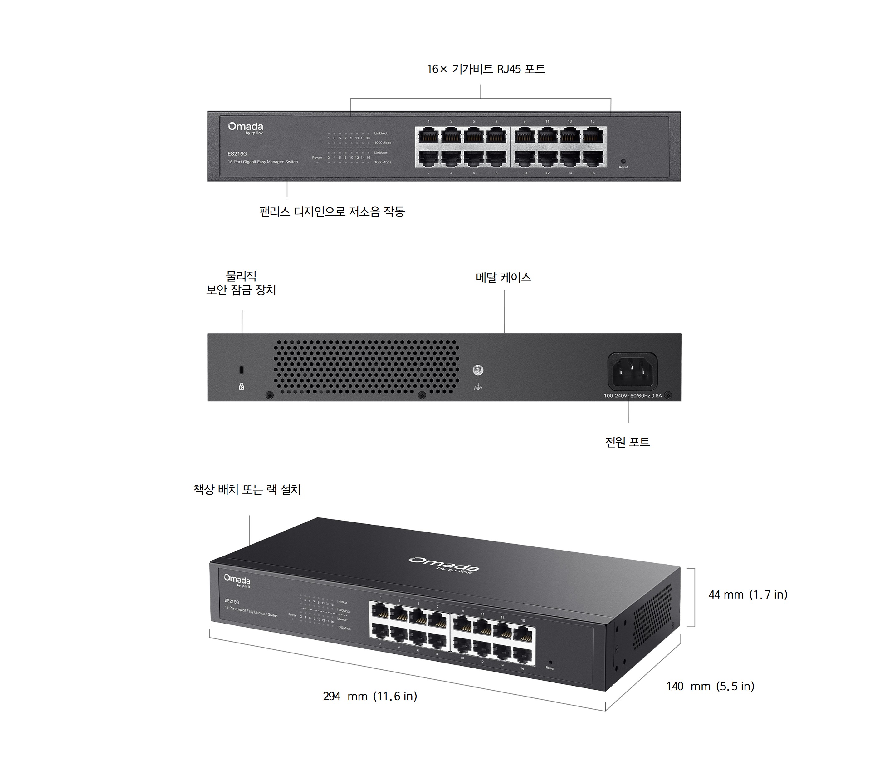 | 인터페이스 및 주요 사양 | • 16× 10/100/1000 Mbps RJ45 포트 • 자동 협상/자동 MDI/MDIX |