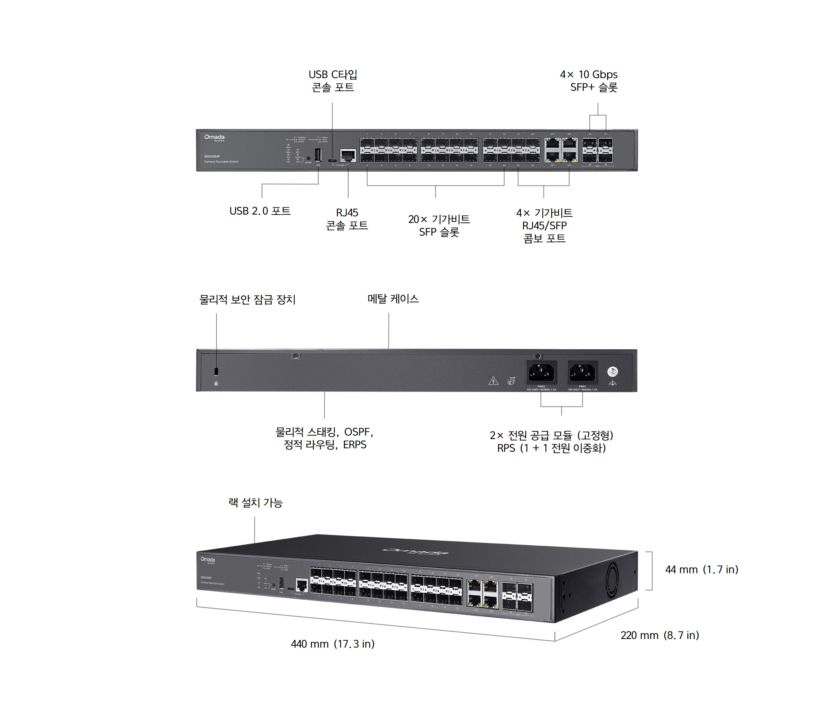 | 인터페이스 및 주요 사양 | • 20× 100/1000 Mbps SFP 슬롯 • 4× Gigabit RJ45/SFP 콤보 슬롯 • 4× 1/10 Gbps SFP+ 슬롯* • 1× USB 2.0 포트 • 1× RJ45 콘솔 포트 • 1× USB C타입 콘솔 포트 |