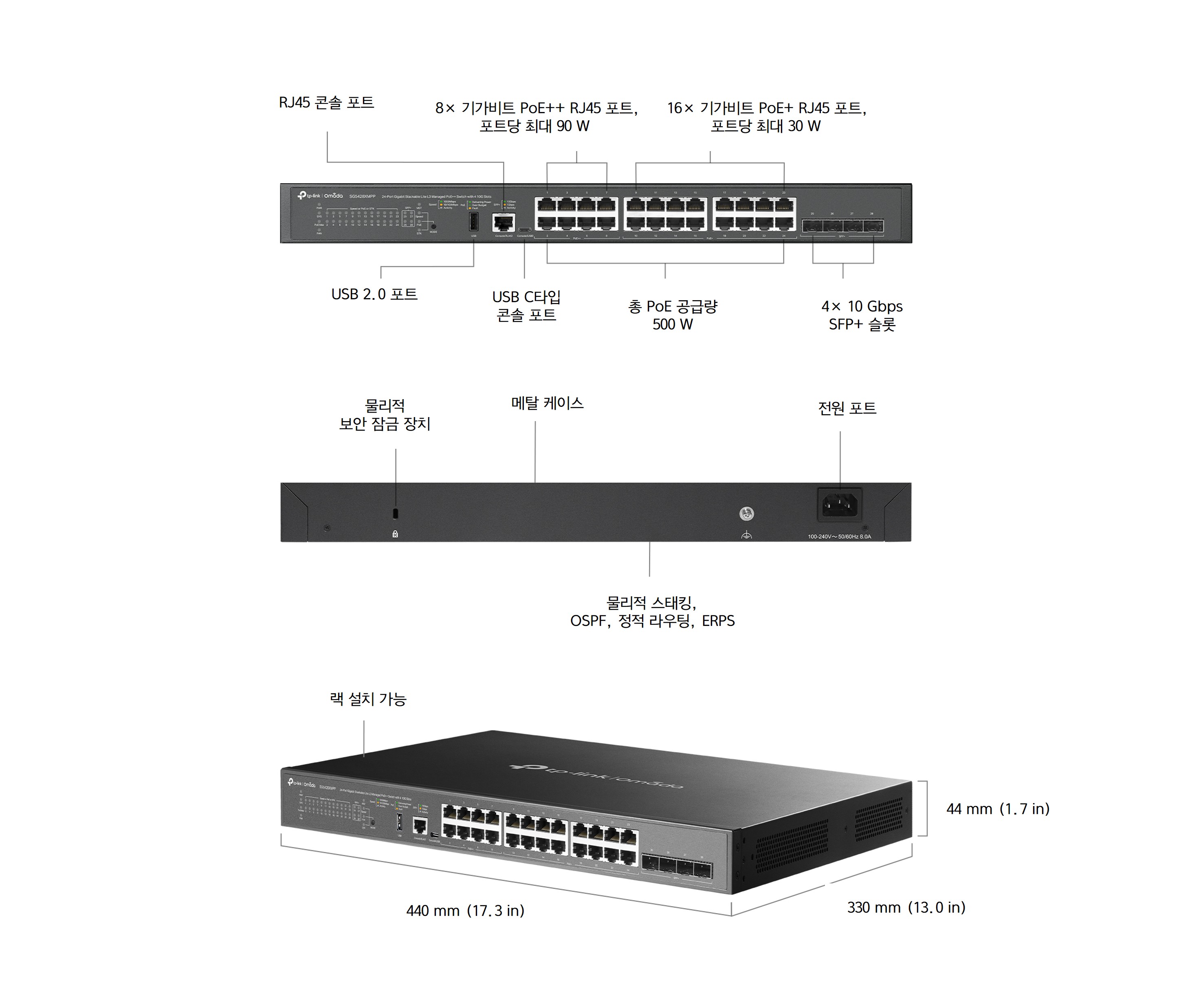 | 인터페이스 및 주요 사양 | • 24× 10/100/1000 Mbps RJ45 포트 (8× PoE++, 16× PoE+) • 4× 1/10 Gbps SFP+ 슬롯** • 1× USB 2.0 포트 • 1× RJ45 콘솔 포트 • 1× USB C타입 콘솔 포트 |