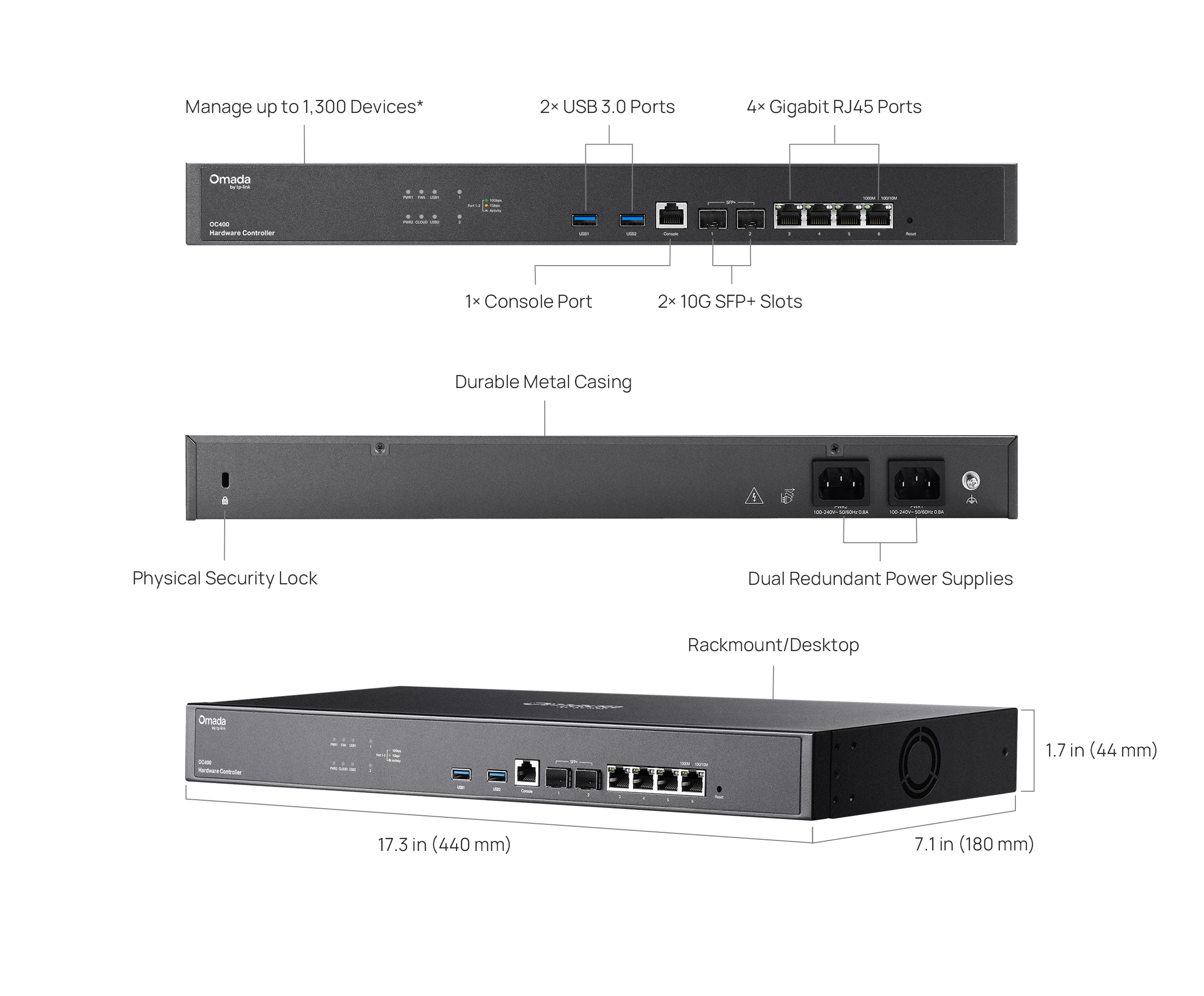 | Package Content | • Omada Hardware Controller OC400• Quick Installation Guide • Ethernet Cable• Power Cord• Rackmount Kit |