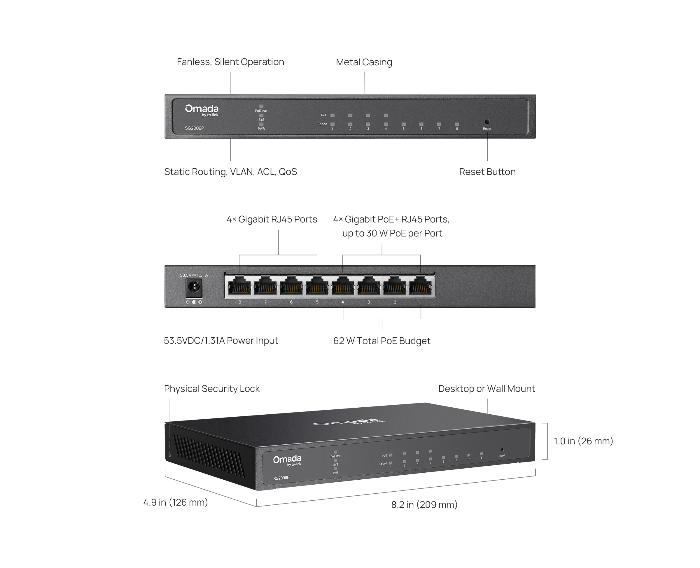 - 8× Gigabit ports (4× 802.3at/af-compliant PoE+ ports)