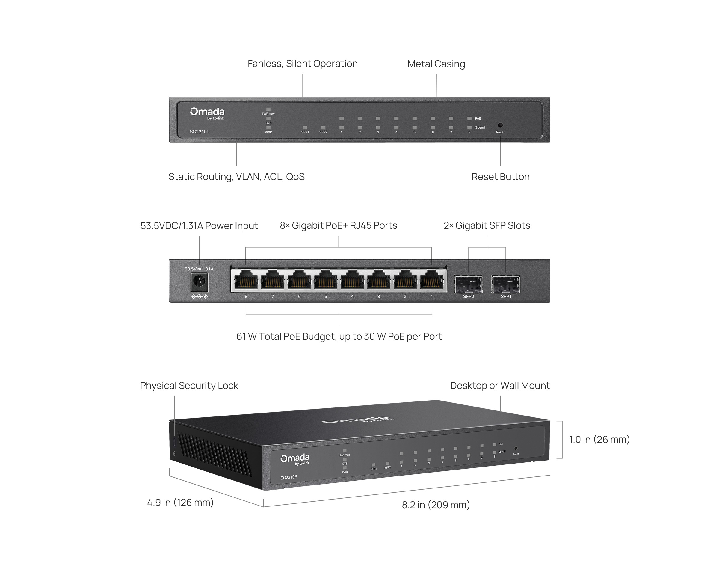 - 8× Gigabit 802.3af/at PoE+ ports and 2× Gigabit SFP slots