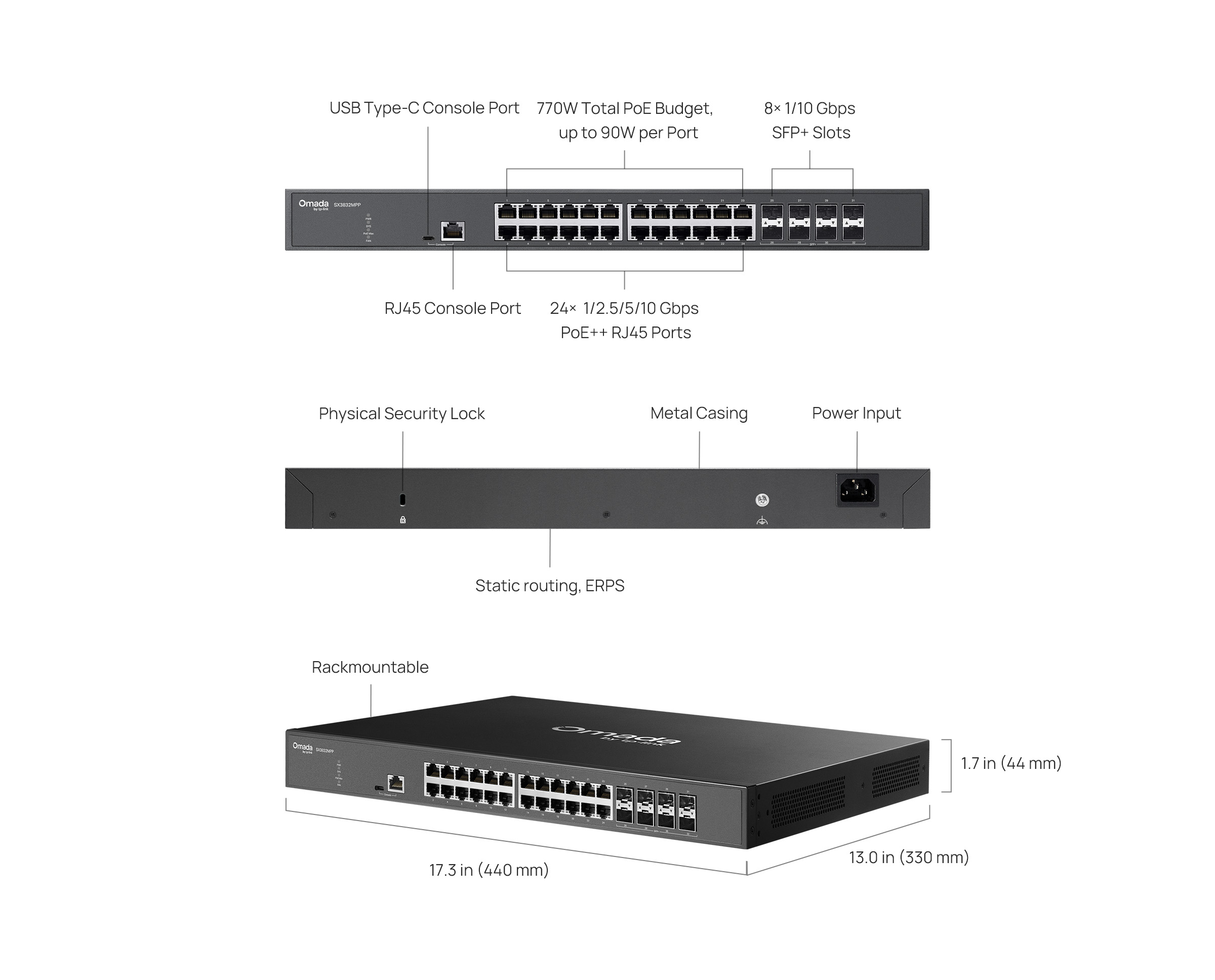 | Interface | • 24× 10Mbps/100Mbps/1Gbps/2.5Gbps/5Gbps/10Gbps PoE++ RJ45 Ports (Auto-Negotiation/Auto MDI/MDIX)• 8× 1/10G SFP+ Slots‡• 1× RJ45 Console Port• 1× USB Type C Console Port |