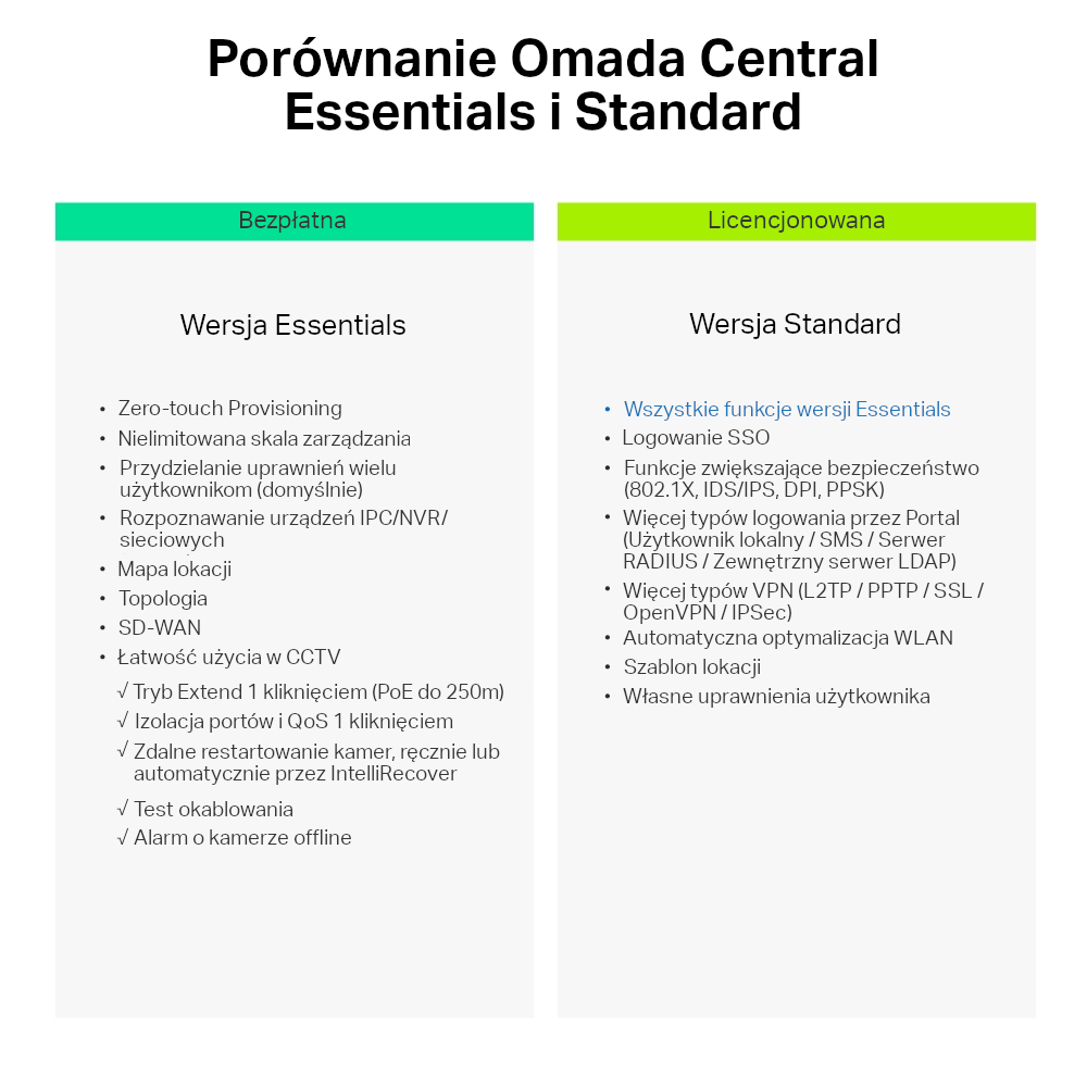 | Omada Cloud Essentials | Omada Cloud Standard | Kontroler sprzętowy Omada | Kontroler programowy Omada | ||||||||||||||||||||||||||||||||