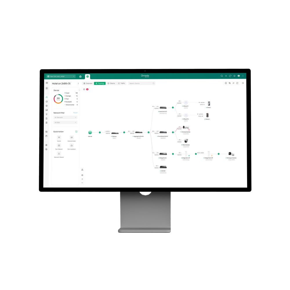 - Nielimitowana skala zarządania: Scentralizowane zarządzanie nielimitowaną ilością punktów dostępowych, przełączników i bram sieciowych Omada*