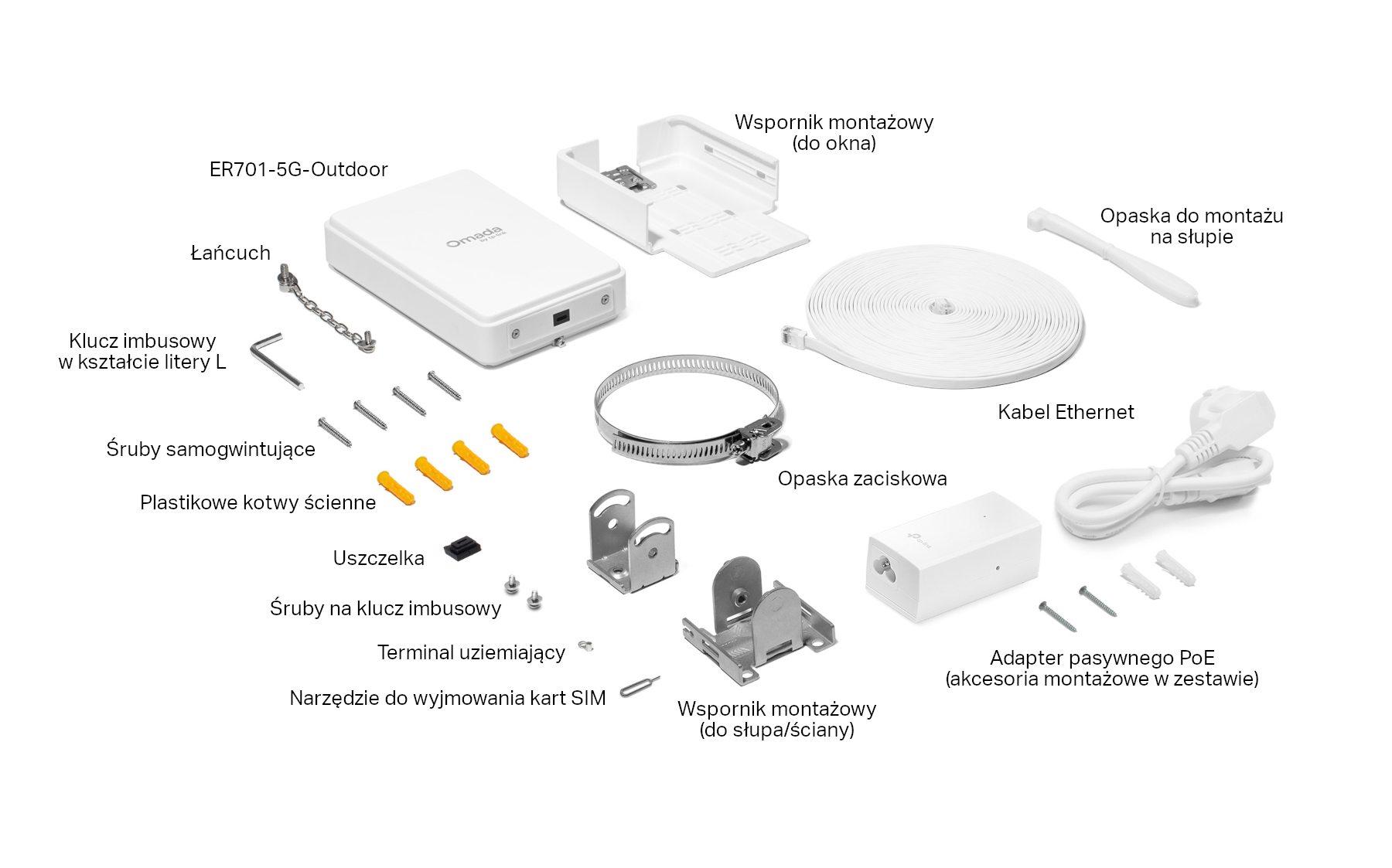 | Zawartość opakowania | • ER701-5G-Outdoor • Adapter pasywnego PoE • Zestaw montażowy • Zestaw uszczelniający • Instrukcja szybkiej instalacji |