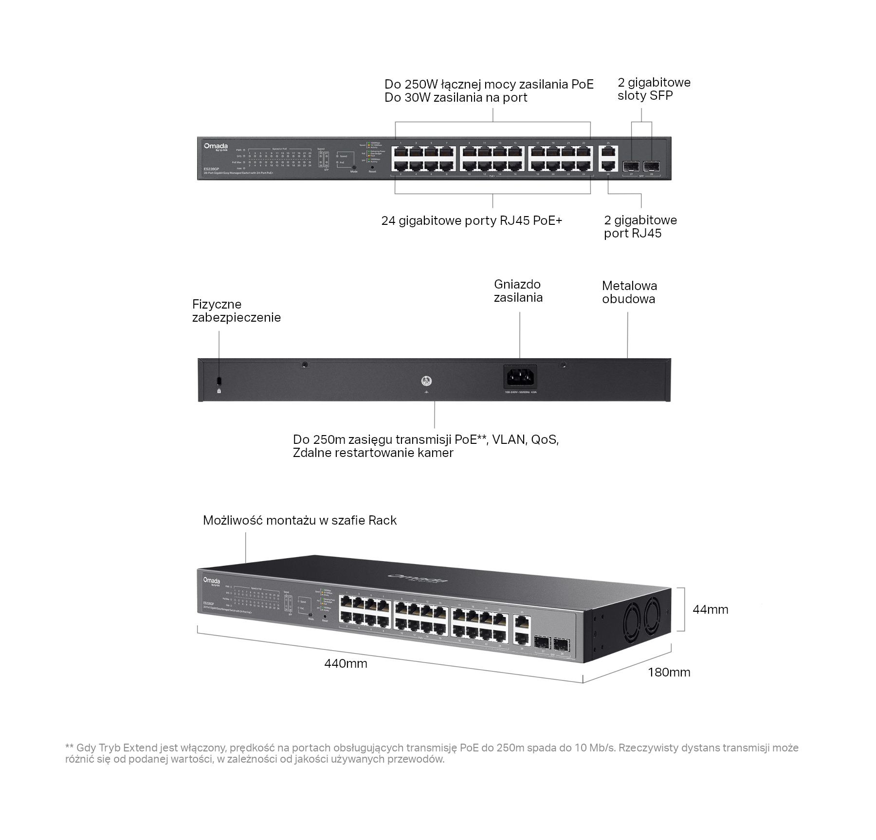 ** Gdy Tryb Extend jest włączony, prędkość na portach obsługujących transmisję PoE do 250m spada do 10 Mb/s. Rzeczywisty dystans transmisji może różnić się od podanej wartości, w zależności od jakości używanych przewodów.