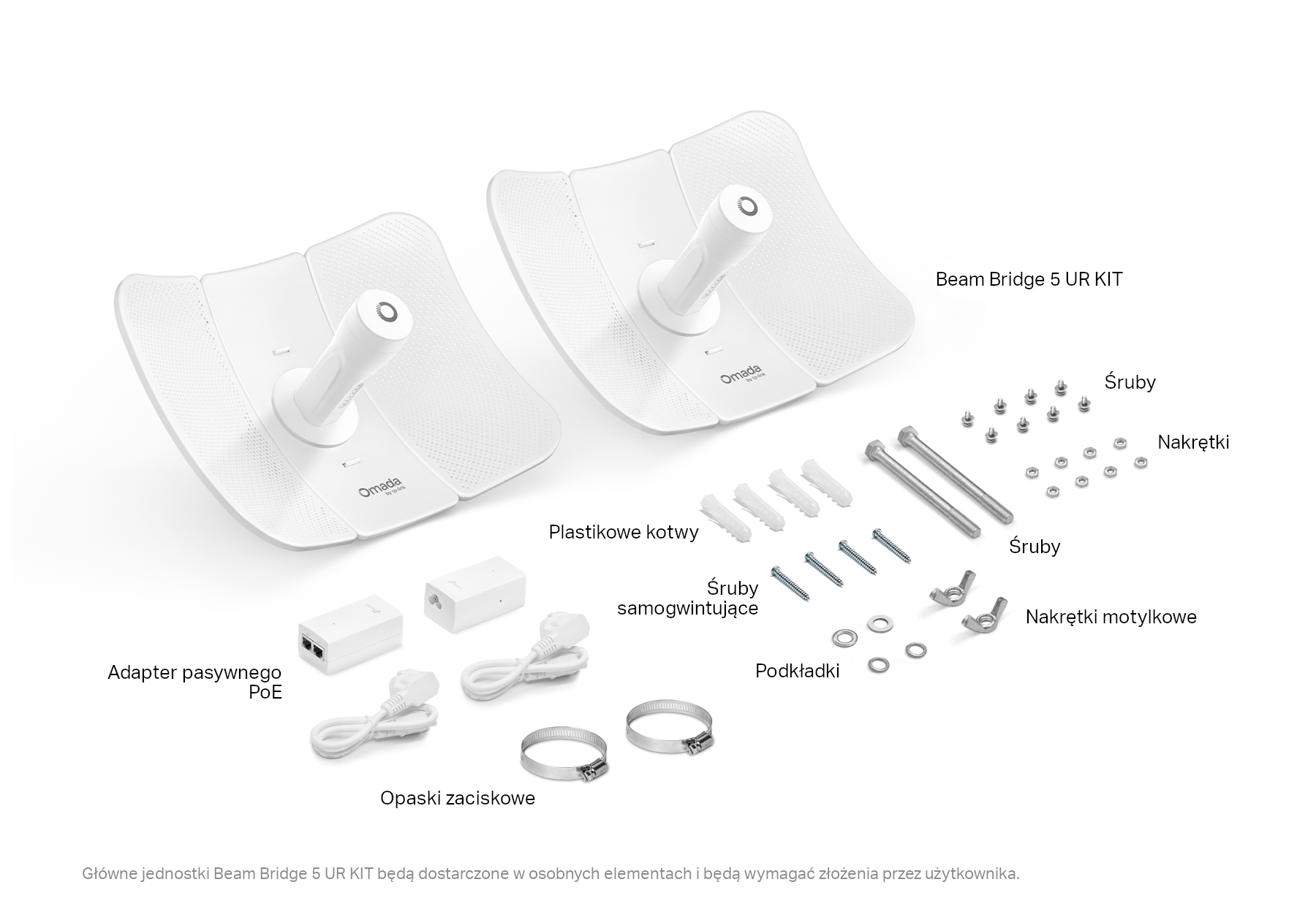 | Zawartość opakowania | • Beam Bridge 5 UR KIT • Instrukcja instalacji • Zestaw montażowy • Adapter pasywnego PoE • Przewód zasilający |