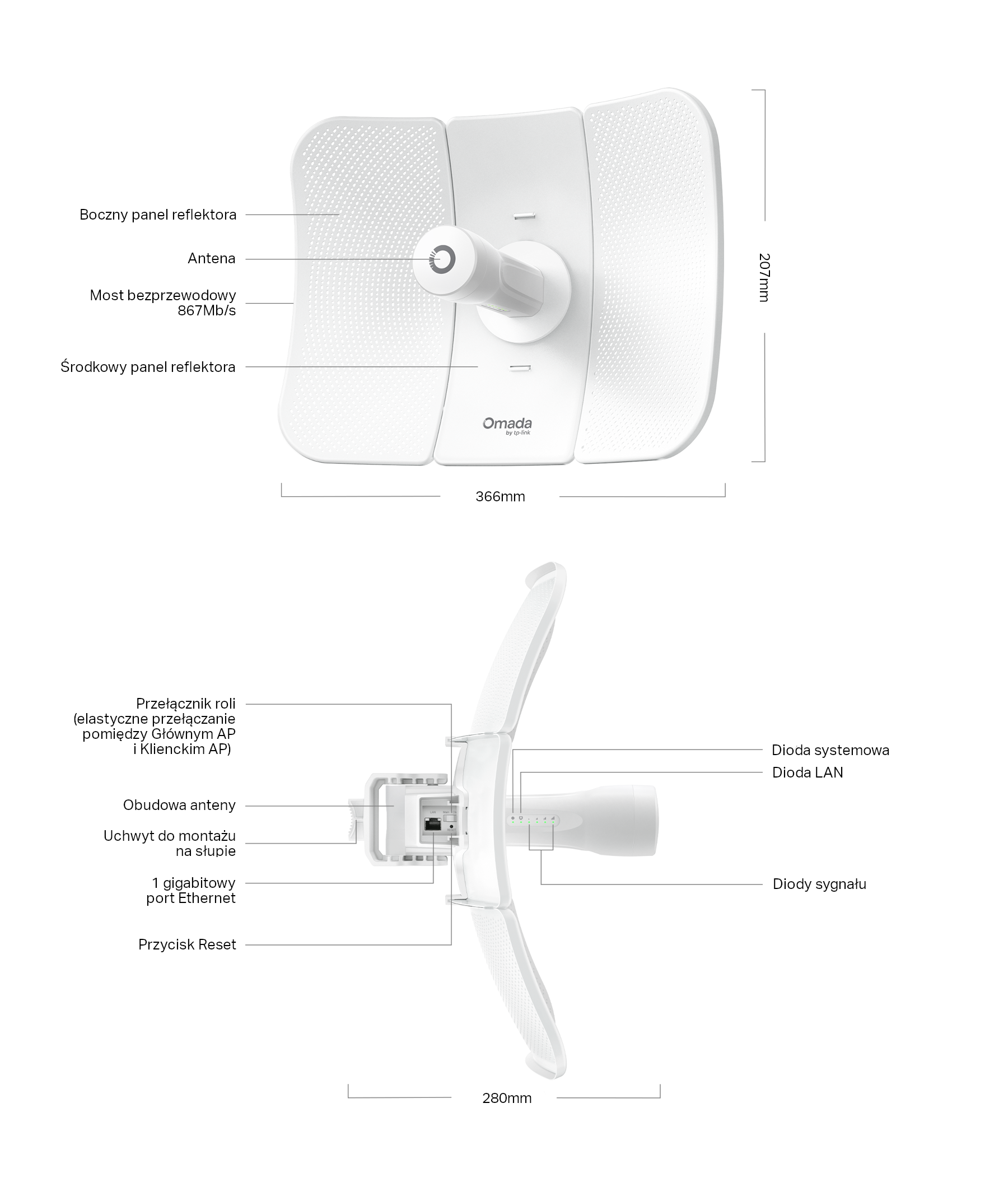 | Anteny | Zewnętrzne, podwójnie spolaryzowane, kierunkowe anteny MIMO 2×2 5 GHz: 23 dBi |