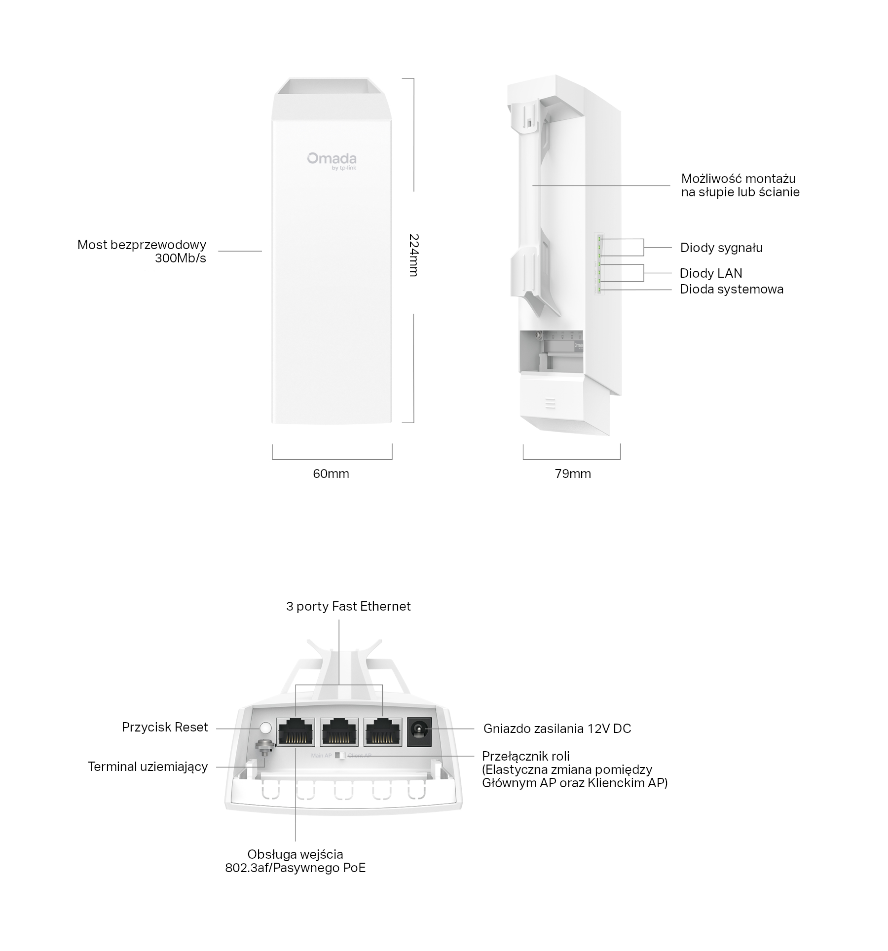 - Elastyczne zasilanie: 802.3af PoE (piny 1/2, piny 3/6), Pasywne PoE 24V /48V (piny +4/5, piny -7/8) oraz 12V DC (kompatybilne z systemami solarnymi TP‑Link)