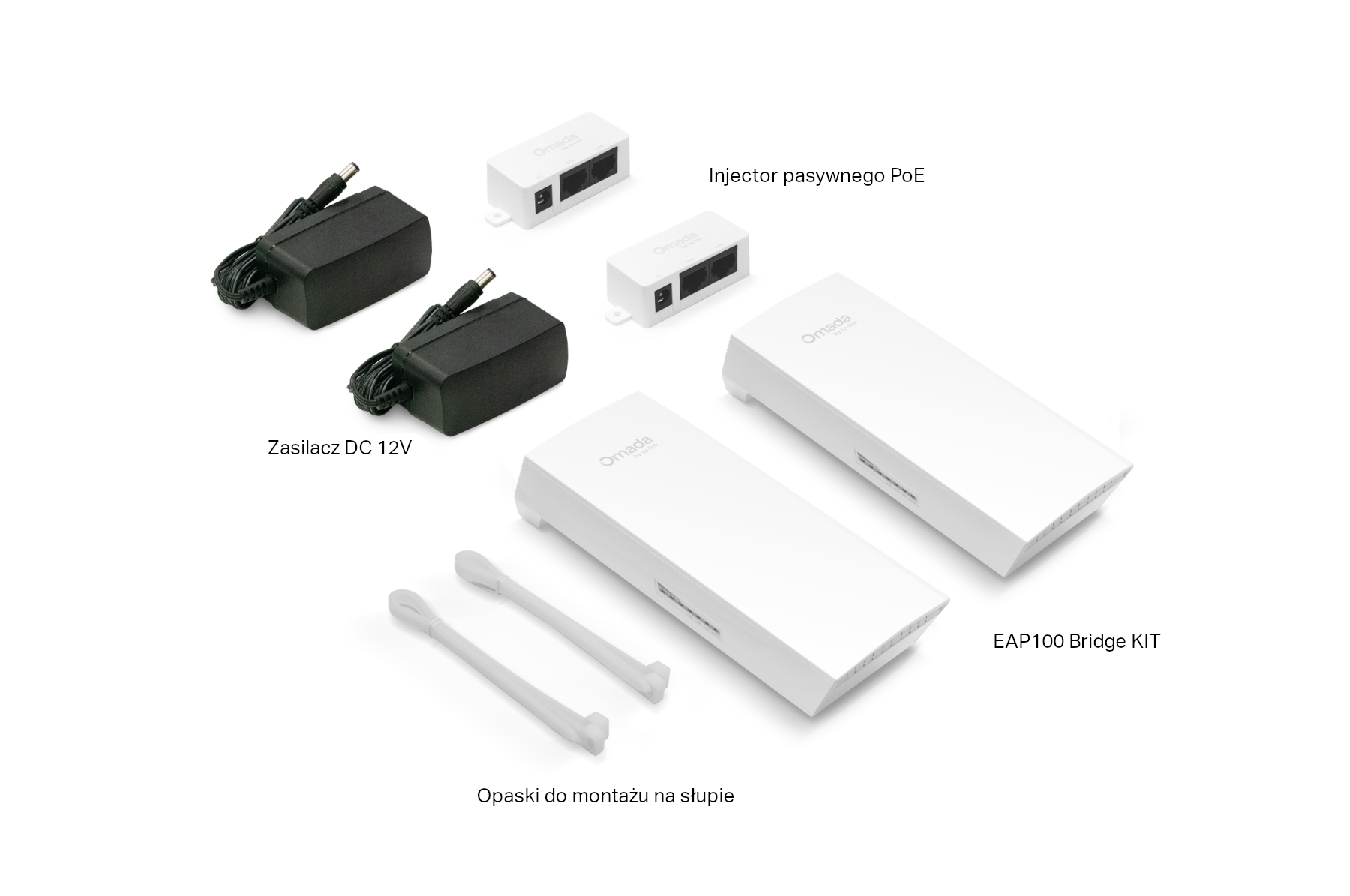 | Zawartość opakowania | • EAP100-Bridge KIT • Instrukcja instalacji • Zestaw do montażu na słupie • Zasilacz 12V DC • Injector pasywnego PoE |