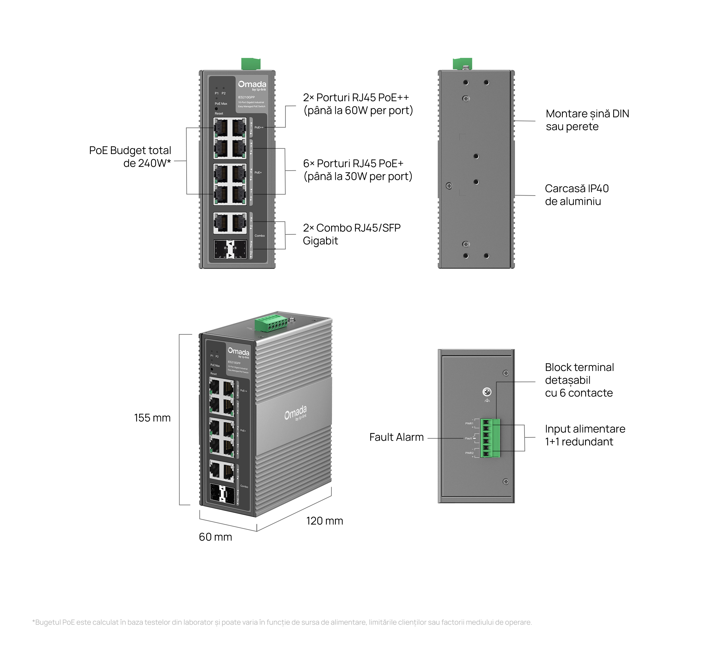 | Porturi (RJ45) PoE | • Standard: 802.3af/at/bt compliant• PoE++ Ports (802.3af/at/bt PoE): 2 Ports, up to 60W per port• PoE+ Ports (802.3af/at PoE): 6 Ports, up to 30W per port• PoE Budget: - 60W (Input: 12V / 7.2A - 21V / 3.7A))- 120W (Input: 21V / 6.7A - 46V / 3.1A)- 240W (Input: 46V / 5.7A - 57V / 4.4A) |