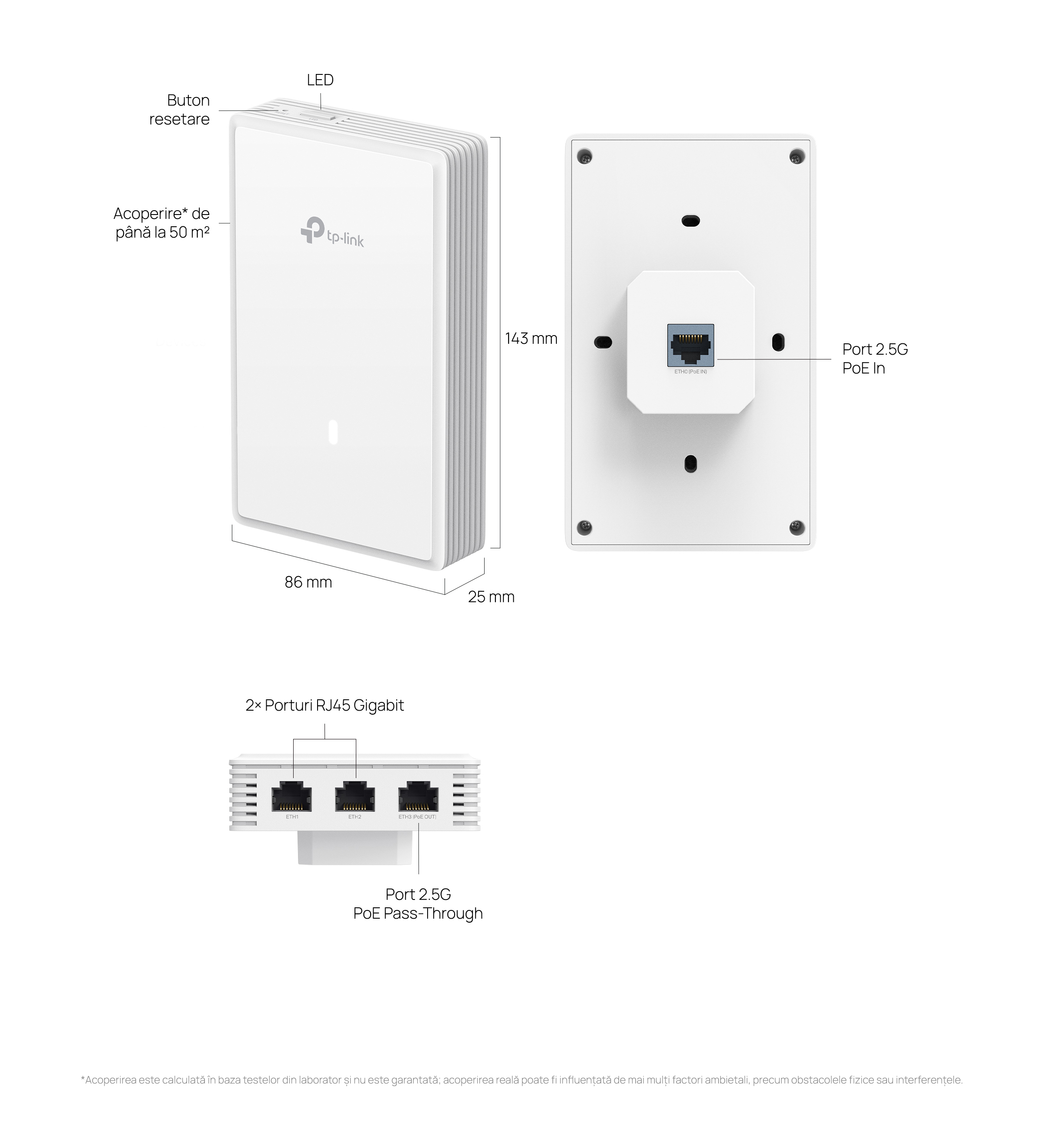 | Interfață | • Uplink: 1× Port 2.5G • Downlink: 1× Port 2.5G + 2× Porturi 1G (Portul 2.5G acceptă PoE pass-through. Funcția PoE pass-through necesită intrare 802.3at/bt. Dacă consumul de energie al dispozitivului downstream al Access Point-ului depășește 7W, Access Point-ul necesită o intrare 802.3bt.) |