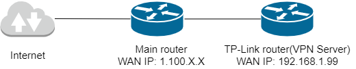 Lấy sơ đồ sau làm ví dụ: Tính năng VPN Server được bật trên Router TP-Link. Địa chỉ WAN IP của Router chính là 1.100.X.X, và địa chỉ WAN IP của Router TP-Link là 192.168.1.99.